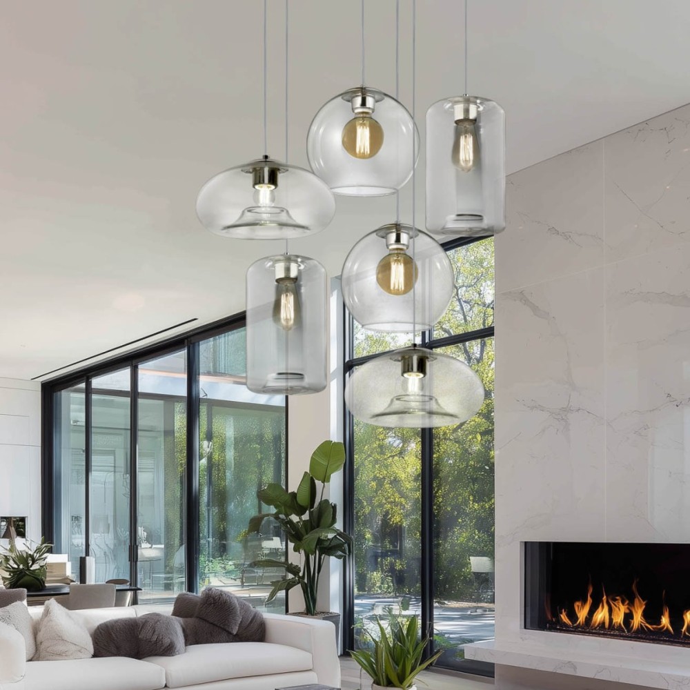 Colgante desigual 6xe27 base redonda cromo/vidrio transparente